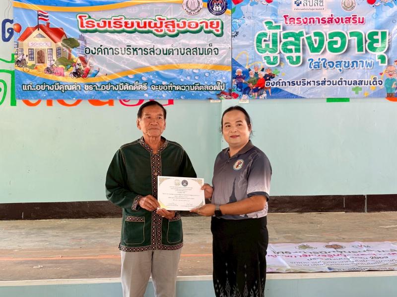 description เมื่อวันที่ 11 เดือนมีนาคม 2569 โรงเรียนผู้สุงอายุ องค์การบริหารส่วนตำบลสมเด็จ นำโดยนายทองจันทร์ เหล่าลุมพุก นายกองค์การบริหารส่วนตำบลสมเด็จ ได้เข้าพบปะและมอบประกาศนียบัตรให้กับวิทยากร กับนักเรียนผู้สูงอายุ ได้เชิญวิทยากร วิทยาลัยเกษตรและเทคโนโลยีมหาสารคาม มาให้ความรู้เกี่ยวกับใส้กรอกวุ้นเส้น บอกสูตรแบบละเอียด ทั้งทำกินทำขาย สูตรนี้บอกเลยอร่อย และสะอาด ออกกำลังกายให้กับผู้สูงวัย โดย อาจารย์ศุภโชติ ศรีพงษ์ชัย เพื่อเสริมสร้างกล้ามเนื้อมีสุขภาพร่างกายแข็งแรงให้กับนักเรียนผู้สูงอายุ person admin