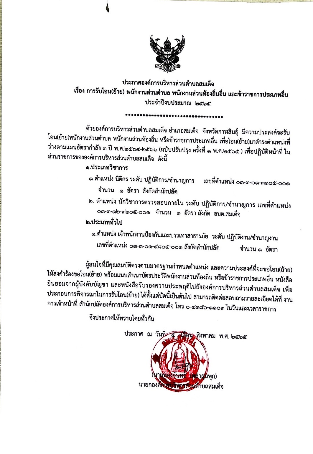 ประกาศองค์การบริหารส่วนตำบลสมเด็จ เรื่อง การรับโอน(ย้าย) พนักงานส่วนตำบล พนักงานส่วนท้องถิ่นอื่น และข้าราชการประเภทอื่น ประจำปีงบประมาณ 2565