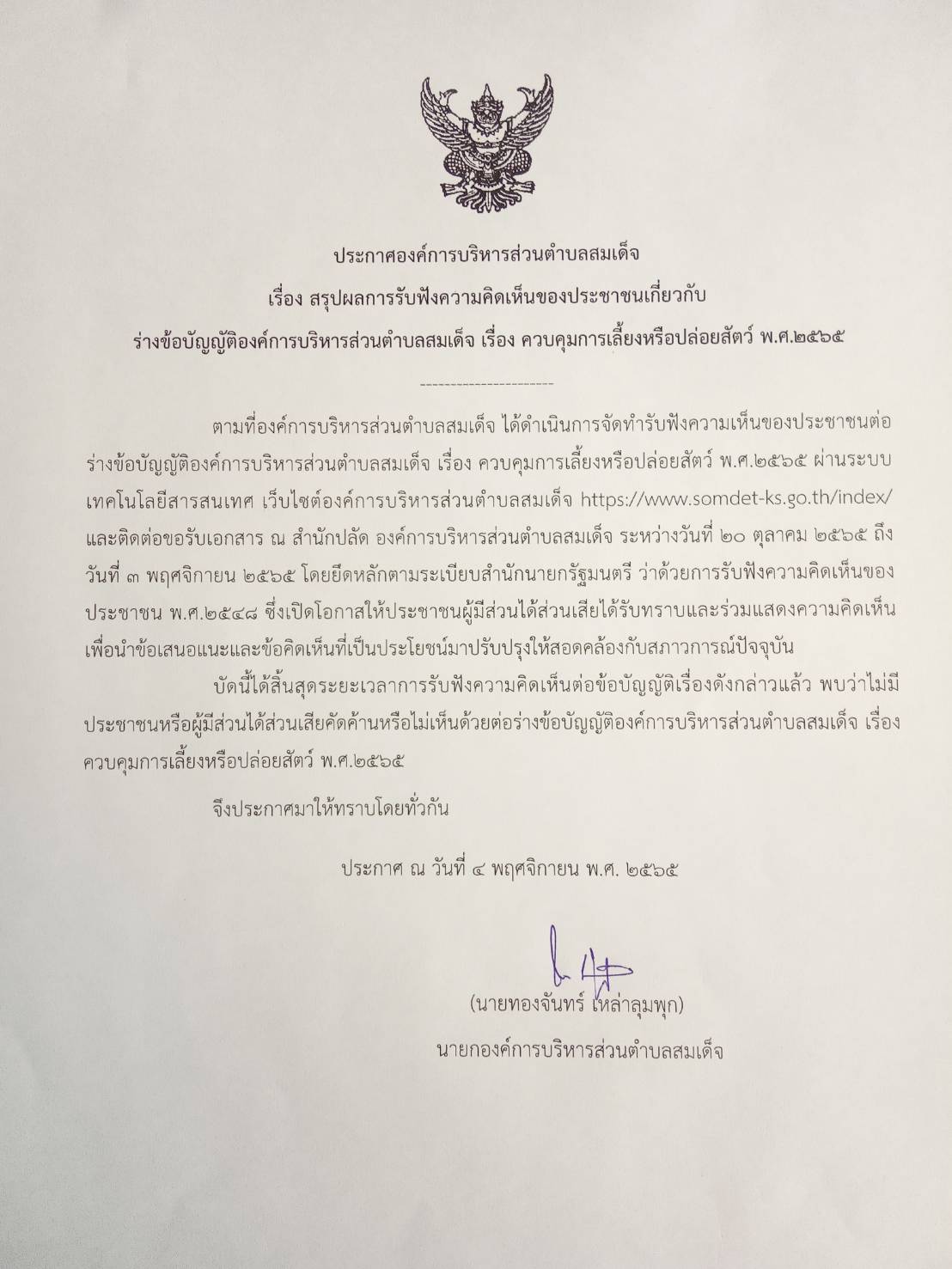 ชื่อเรื่อง : ประกาศองค์การบริหารส่วนตำบลสมเด็จ เรื่อง สรุปผลการรับฟังความคิดเห็นของประชาชนเกี่ยวกับร่างข้อบัญญัติองค์การบริหารส่วนตำบลสมเด็จ เรื่อง ควบคุมการเลี้ยงหรือปล่อยสัตว์ พ.ศ. 2565