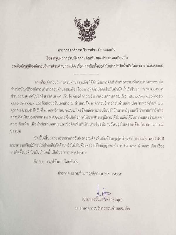 ชื่อเรื่อง : ประกาศองค์การบริหารส่วนตำบลสมเด็จ เรื่อง สรุปผลการรับฟังความคิดเห็นของประชาชนเกี่ยวกับร่างข้อบัญญัติองค์การบริหารส่วนตำบลสมเด็จ เรื่อง การติดตั้งบ่อดักไข่มันบำบัดน้ำเสียในอาคาร พ.ศ. 2565