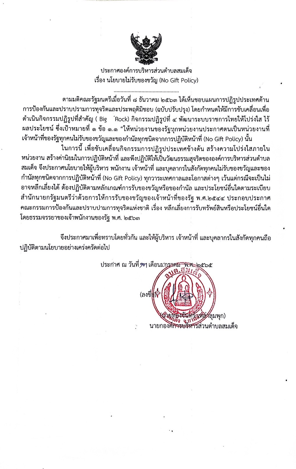 ประกาศงค์การบริหารส่วนตำบลสมเด็จ เรื่อง นโยบายไม่รับของวัญ