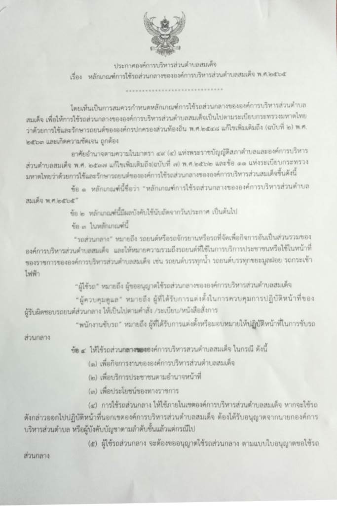 ชื่อเรื่อง : ประกาศองค์การบริหารส่วนตำบลสมเด็จ เรื่อง หลักเกณฑ์การใช้รถส่วนกลางขององค์การบริหารส่วนตำบลสมเด็จ พ.ศ.๒๕๖๕