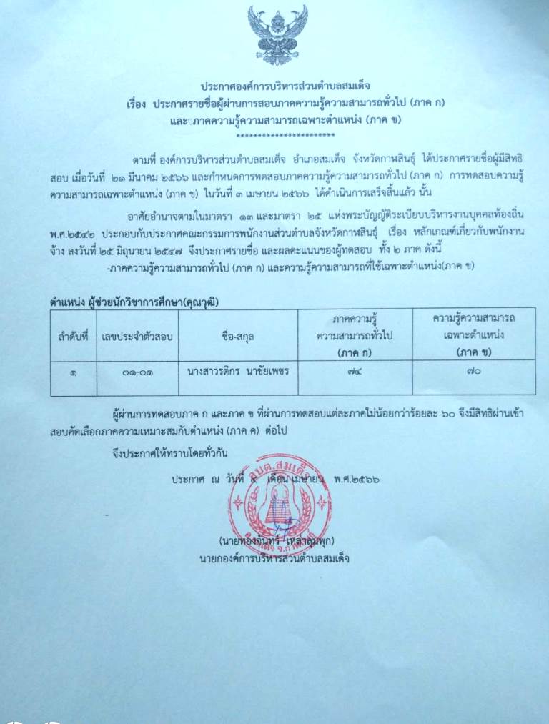 ชื่อเรื่อง : ประกาศจัดซื้อจัดจ้างองค์การบริหารส่วนตำบลสมเด็จ เรื่อง ประกาศรายชื่อผู้ผ่านการสอบภาคความรู้ความสามารถทั่วไป (ภาค ก) และภาคความรู้ความสามารถเฉพาะตำแหน่ง (ภาค ข )
