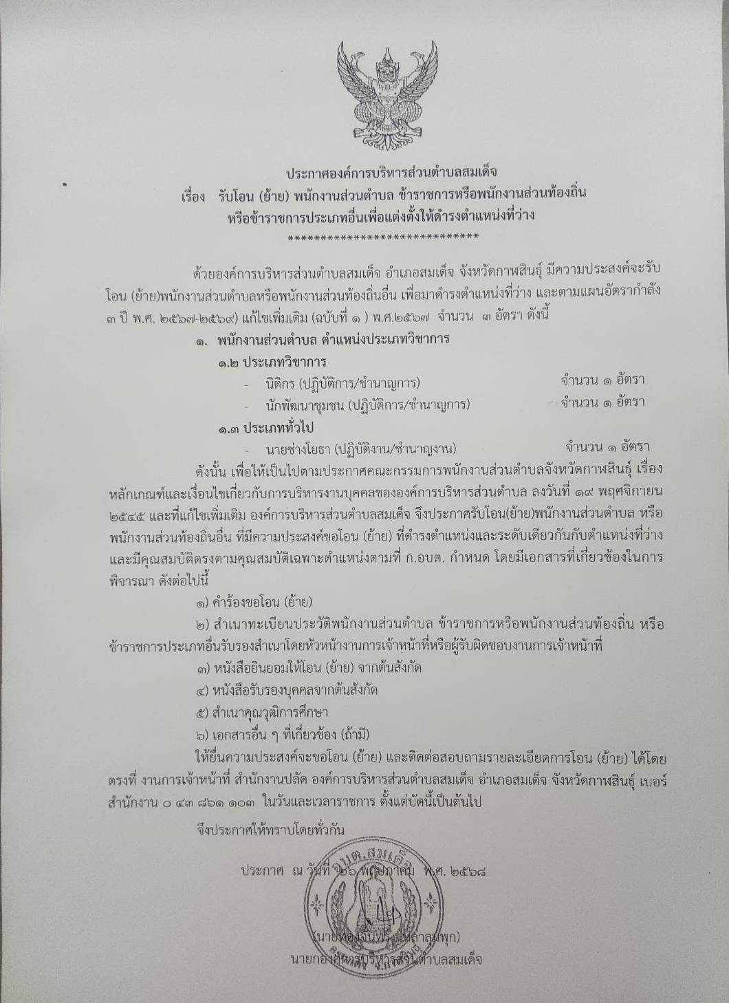 ชื่อเรื่อง : ประกาศองค์การบริหารส่วนตำบลสมเด็จ เรื่อง รับโอน (ย้าย)พนักงานส่วนตำบล ข้าราชการหรือพนักงานส่วนท้องถิ่น หรือข้าราชการประเภทอื่นเพื่อแต่งตั้งให้ดำรงตำแหน่งที่ว่าง
