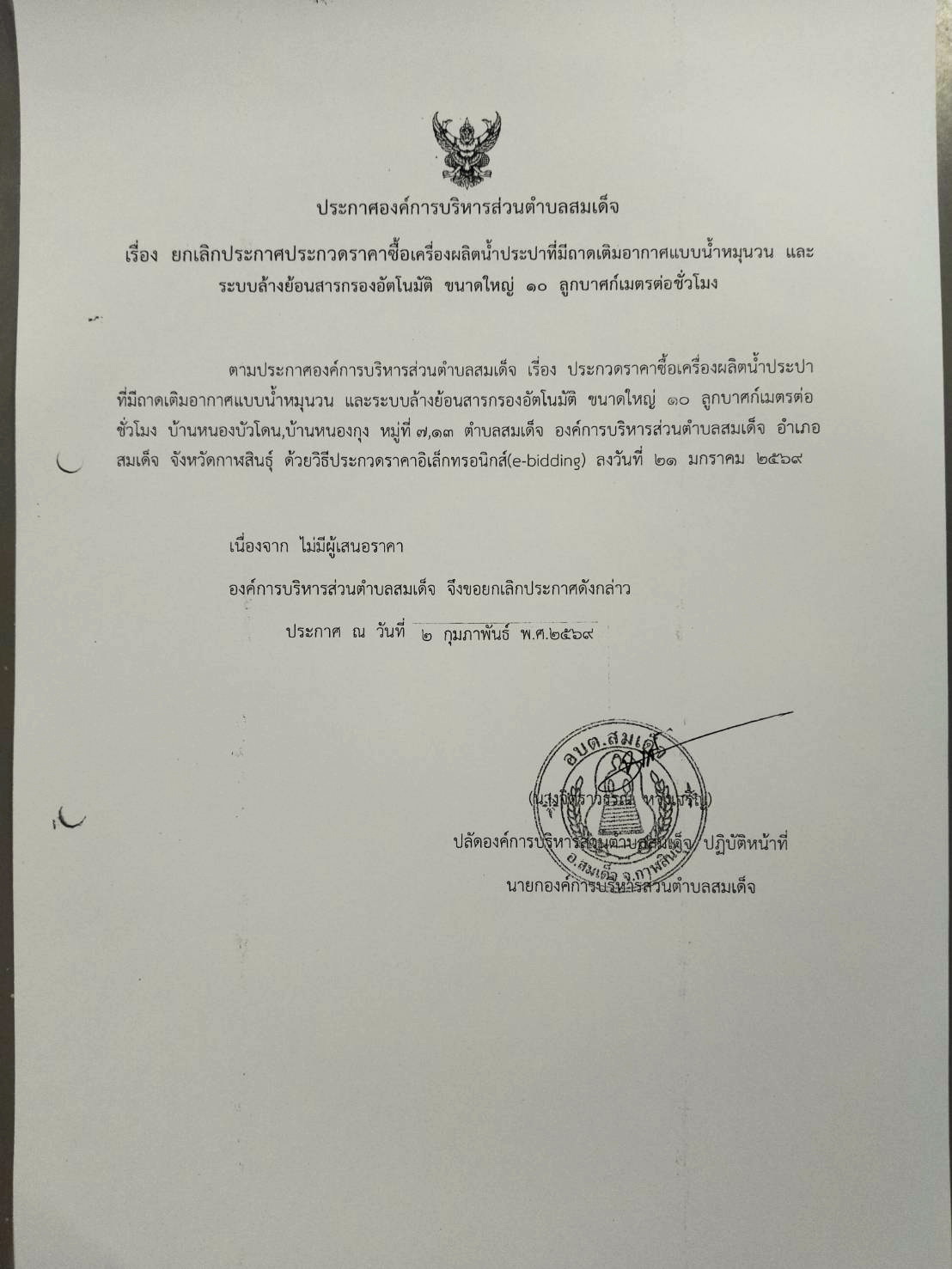 ประกาศองค์การบริหารส่วนตำบลสมเด็จ เรื่อง ยกเลิกประกาศประกวดราคาซื้อเครื่องผลิตน้ำประปาที่มีถาดเติมอากาศแบบน้ำหมุนวน และระบบล้างย้อนสารรองอัตโนมัติ ขนาดใหญ่ 10 ลูกบาศก์เมตรต่อชั่วโมง